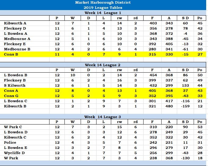 League Table after week 14. League 1 “ Cons B v Fleckney D ” to be played next Tuesday at the MH Conny Club.