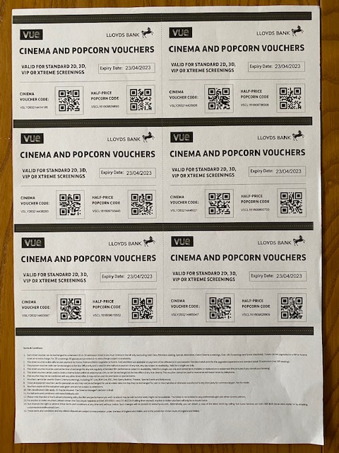 6x Vue Cinema & Popcorn Vouchers valid to 23/4/23