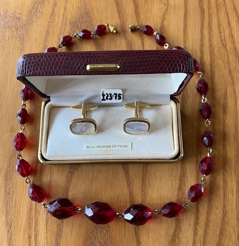 Facetted ruby glass necklace & pair gilded cufflinks set with M.O.P